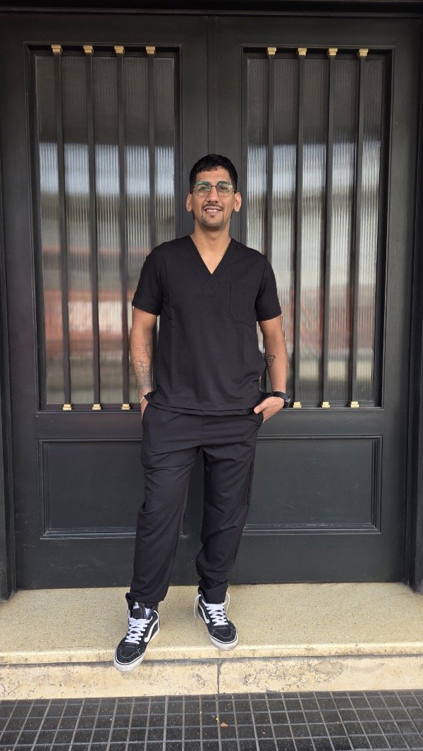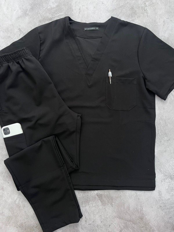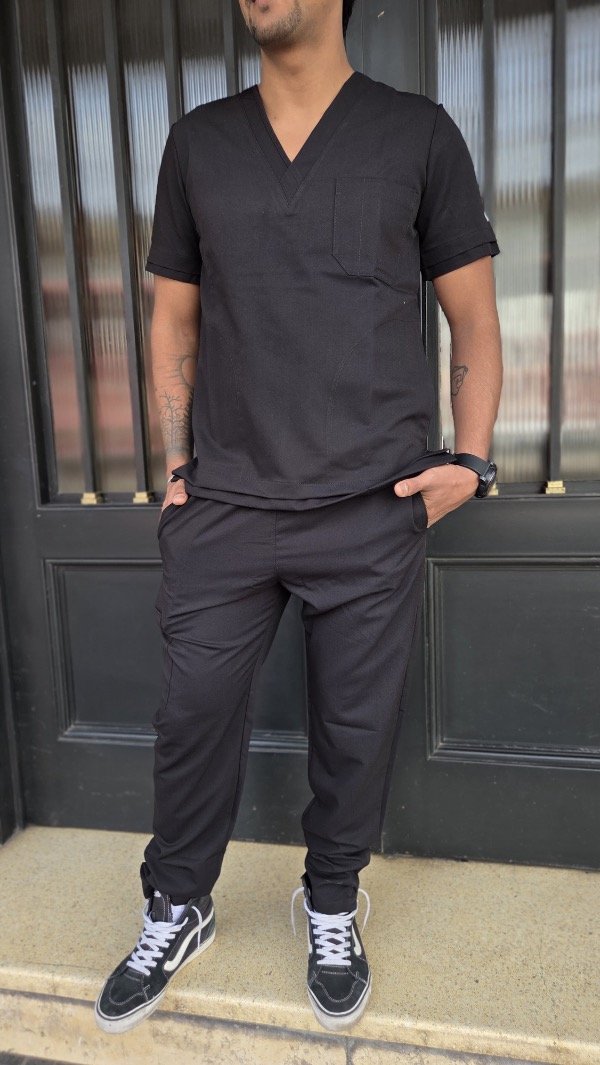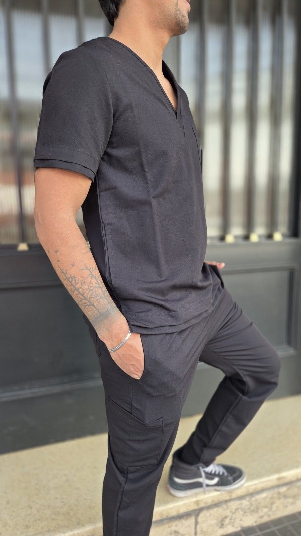 Ambo en tela spandex liviano con bolsillos laterales. Pantalón achupinado con bolsillos tipo cargo.
