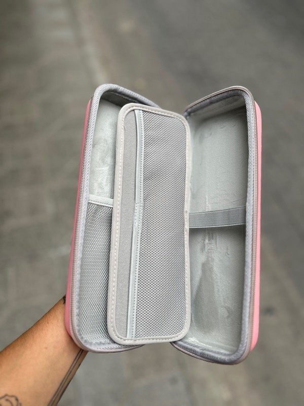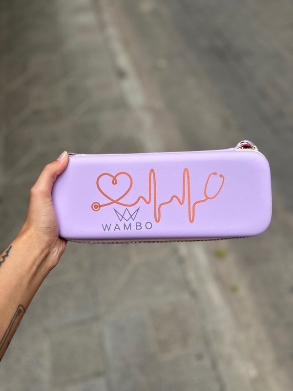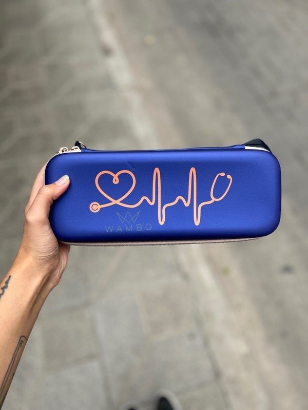 Estuche para estetoscopio con divisor y espacio sectorizado para varias herramientas. Con tira para colgar y gancho para más practicidad.