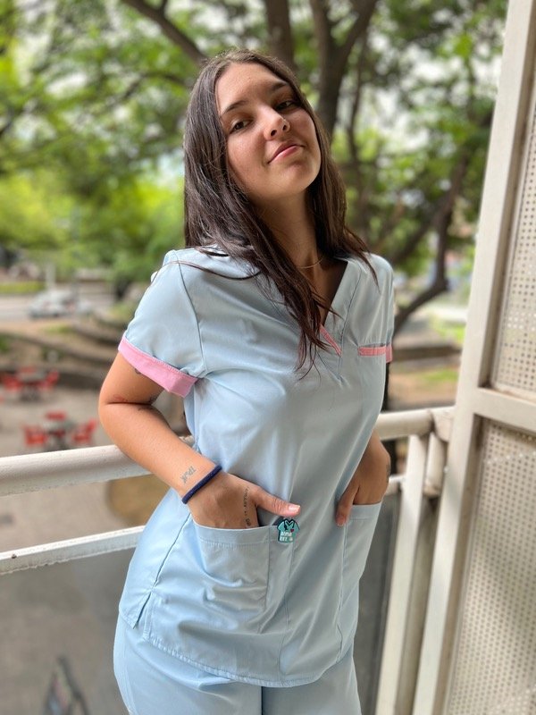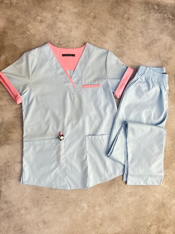 Ambo confeccionado en tela rígida arciel, chaqueta con bolsillos frontales y uno extra superior. Con tira regulable en la espalda