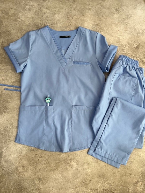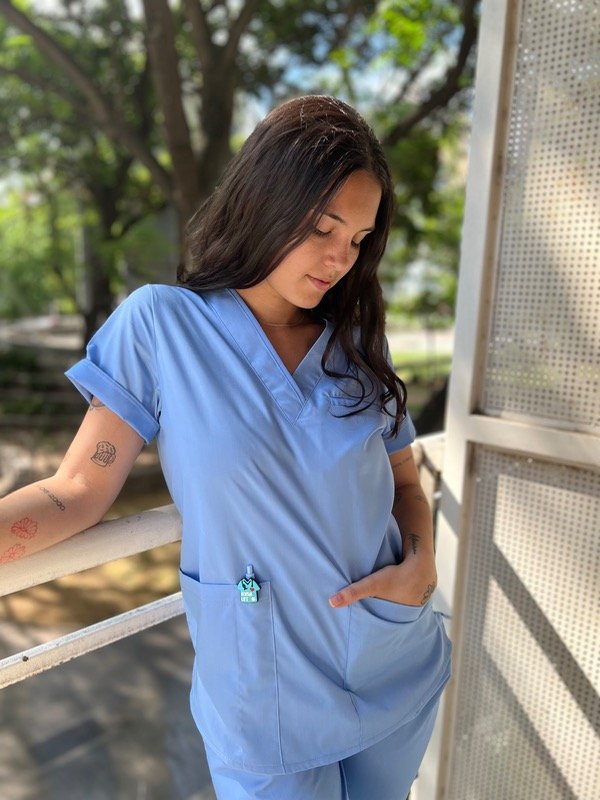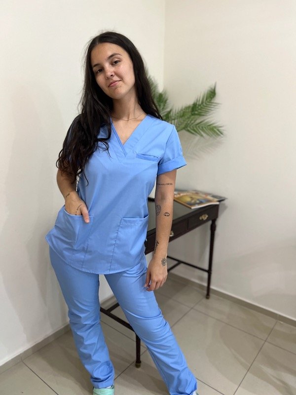 Ambo confeccionado en tela rígida arciel, chaqueta con bolsillos frontales y uno extra superior. Con tira regulable en la espalda