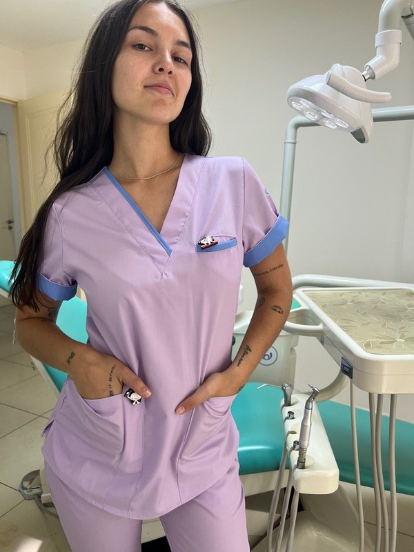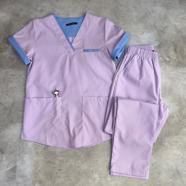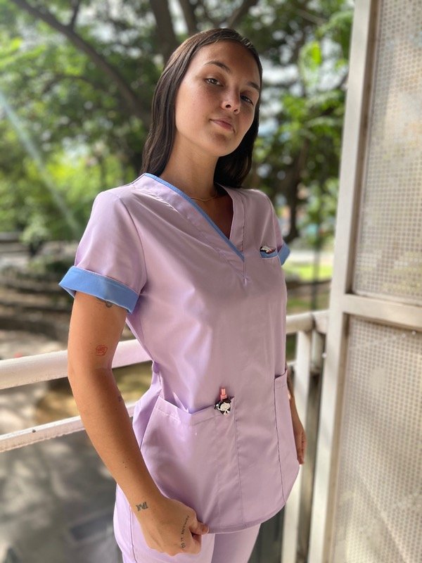 Ambo confeccionado en tela rígida arciel, chaqueta con bolsillos frontales y uno extra superior. Con tira regulable en la espalda