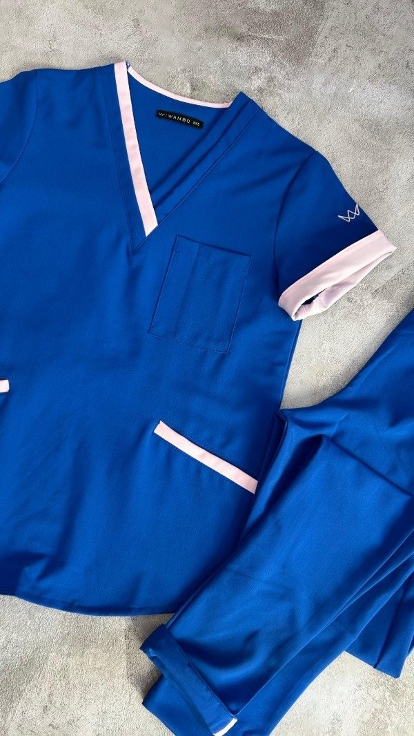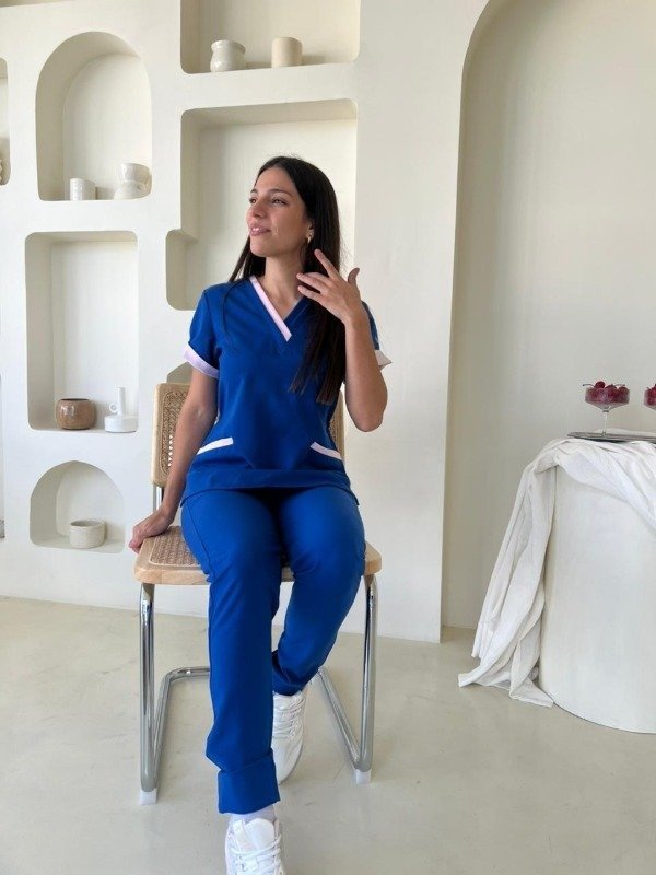 • Chaqueta Azul Francia con cuello en V, cortes modernos y detalles en rosa en el cuello, las mangas y los bolsillos inferiores. Tiene tres bolsillos frontales: uno superior con compartimento porta lapiceras y dos bolsillos inferiores amplios.