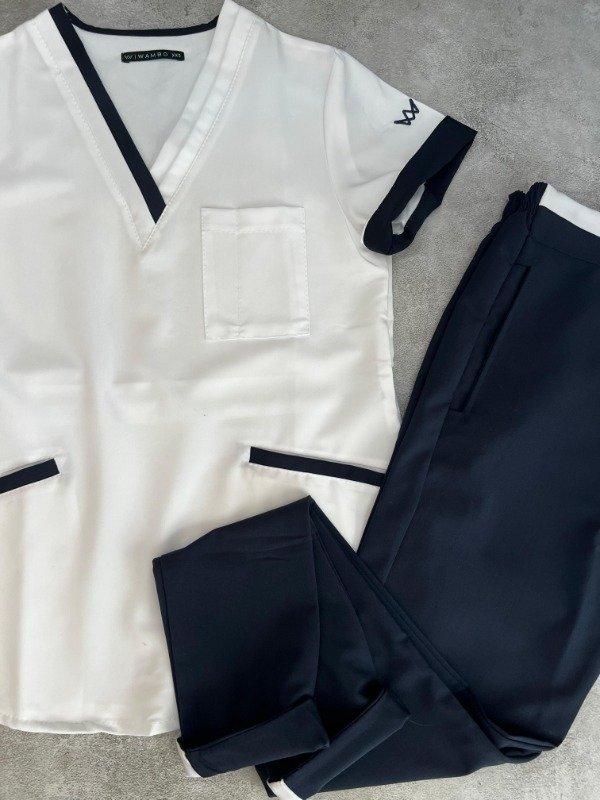 • Chaqueta Blanco con cuello en V, cortes modernos y detalles en Azul Marino en el cuello, las mangas y los bolsillos inferiores. Tiene tres bolsillos frontales: uno superior con compartimento porta lapiceras y dos bolsillos inferiores amplios.