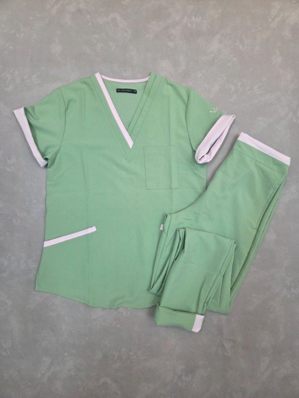 • Chaqueta Verde con cuello en V, cortes modernos y detalles en rosa en el cuello, las mangas y los bolsillos inferiores. Tiene tres bolsillos frontales: uno superior con compartimento porta lapiceras y dos bolsillos inferiores amplios.