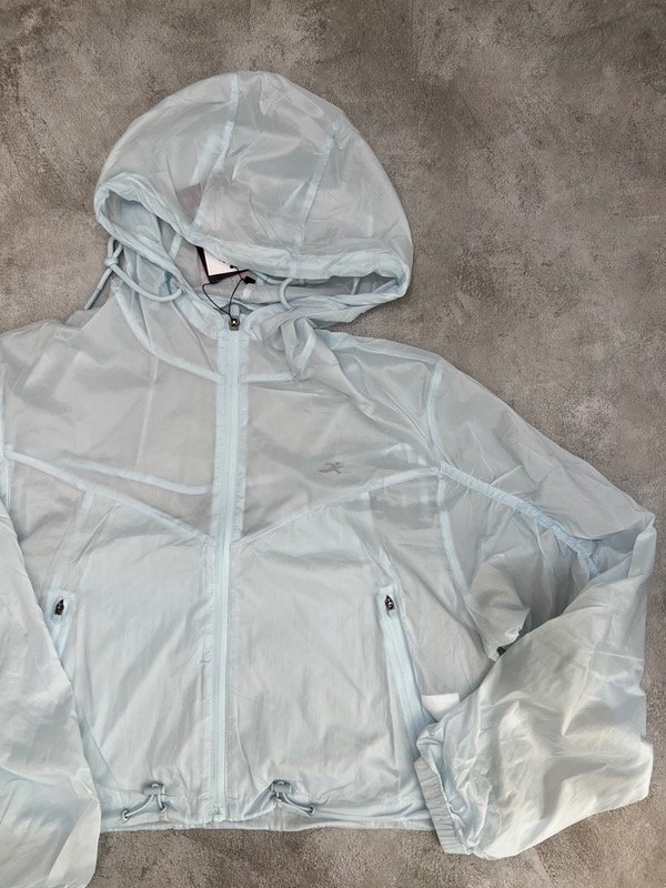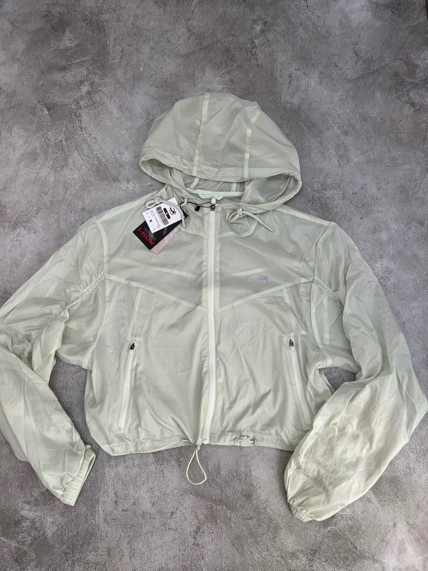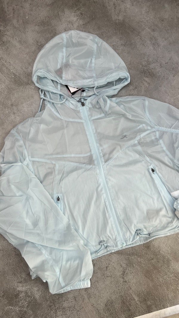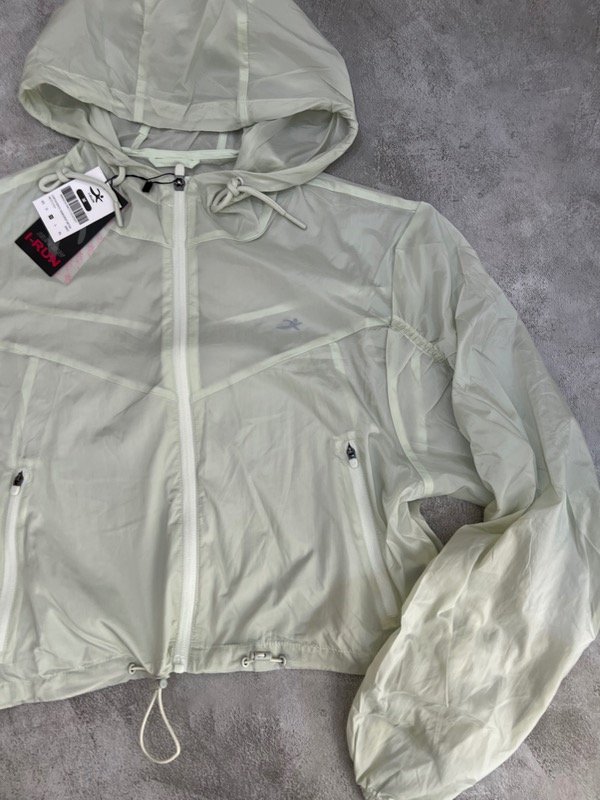 Campera rompeviento crop con capucha regulable, cintura regulable, bolsillos con cierre, puño con elástico.